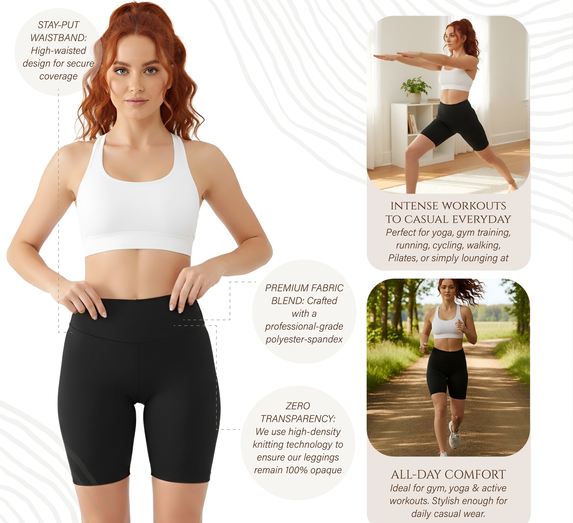 Designed with a secure high-rise waistband, these shorts offer gentle tummy control while staying firmly in place throughout your workout or daily activities. Whether you’re stretching, running, cycling, or simply relaxing, the stay-put design ensures all-day confidence and support.